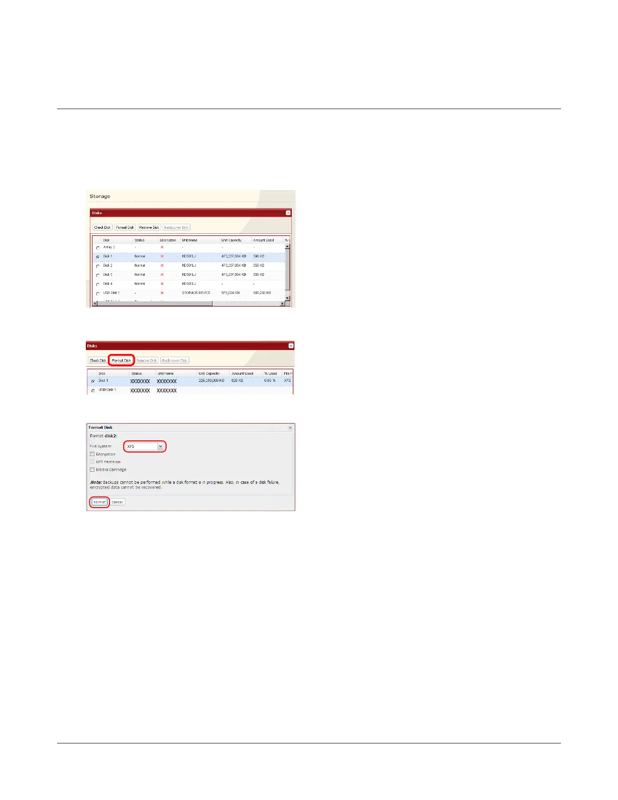 • Do not turn o or disconnect power to the TeraStation while formatting a hard drive.