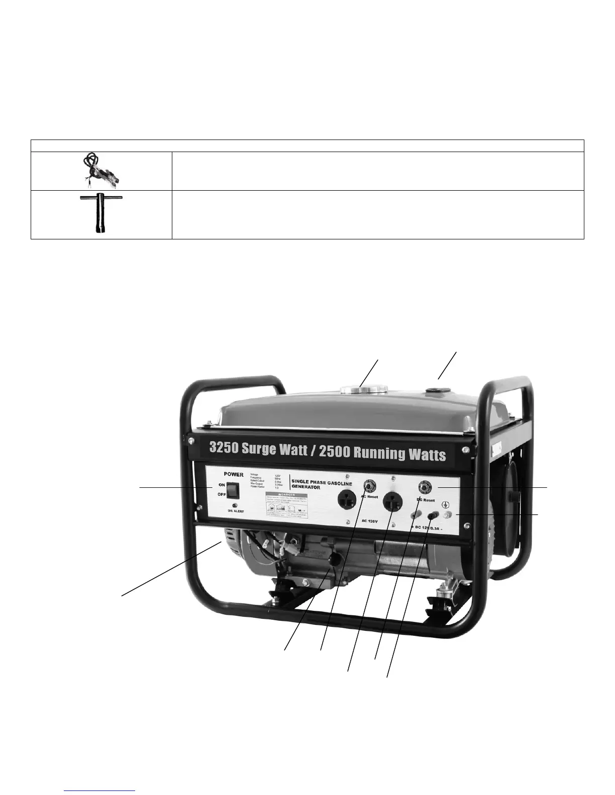 The following items are supplied with this Model GEN3250 Portable Generator. Verify that all items are included.