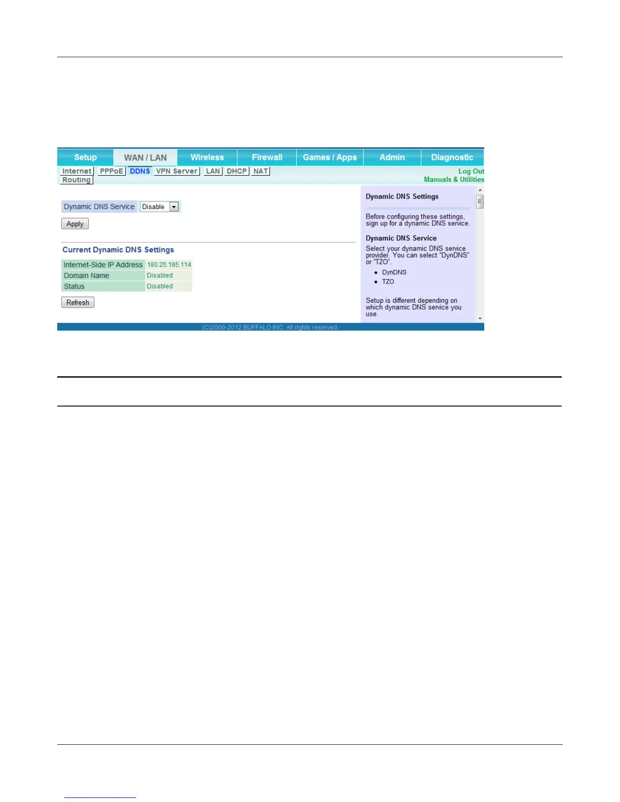 Dynamic DNS Service Select a provider (DynDNS or TZO) for dynamic DNS.