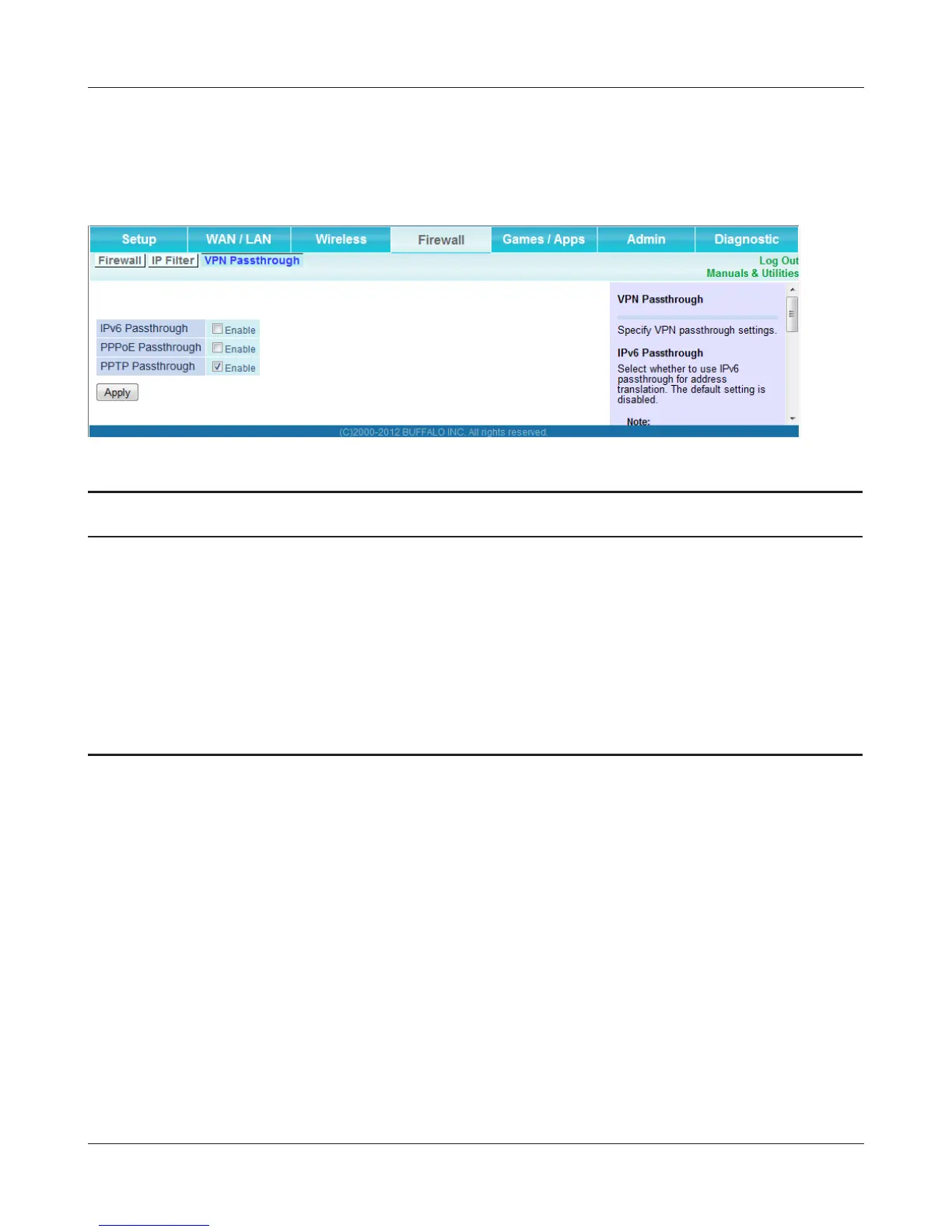 Congure IPv6 passthrough, PPPoE passthrough, and PPTP passthrough.