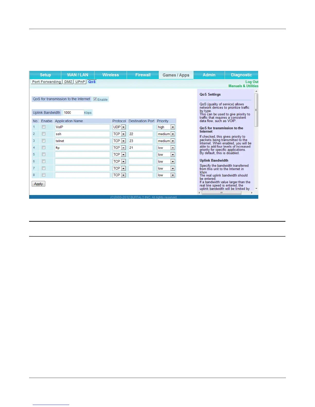 QoS for transmission to the Internet Enable to give priority to specic types of Internet trac.