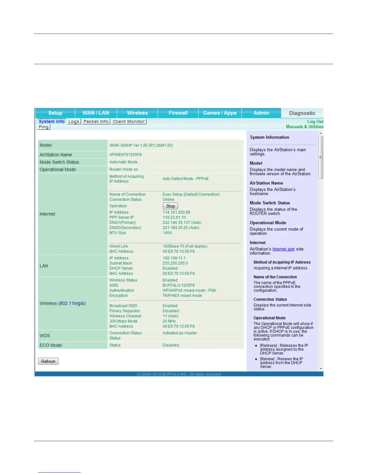 Buffalo AirStation NFINITI High Power WHR-300HP - Diagnostic; System Info