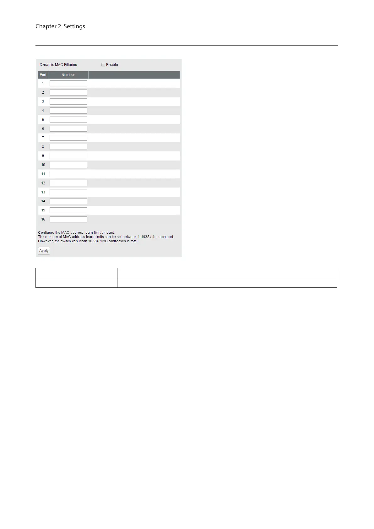 • If the port’s “Number” field is left blank, all MAC addresses can pass through that port.