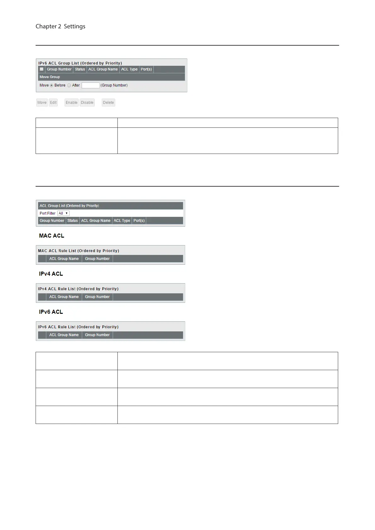 IPv6 ACL Group List Displays the list of ACL groups. Groups are listed in order of the priority.