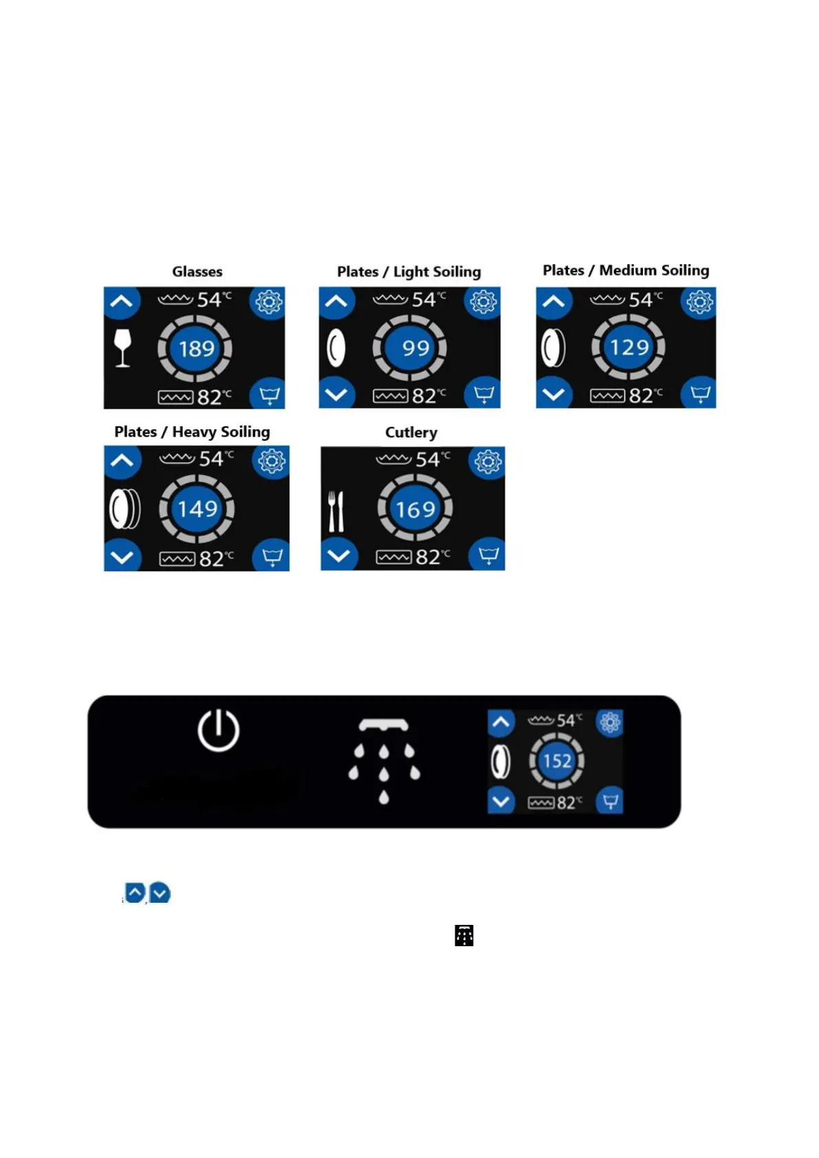 Select the appropriate Washing program depending on type of dishes and degree of soiling with program selection
