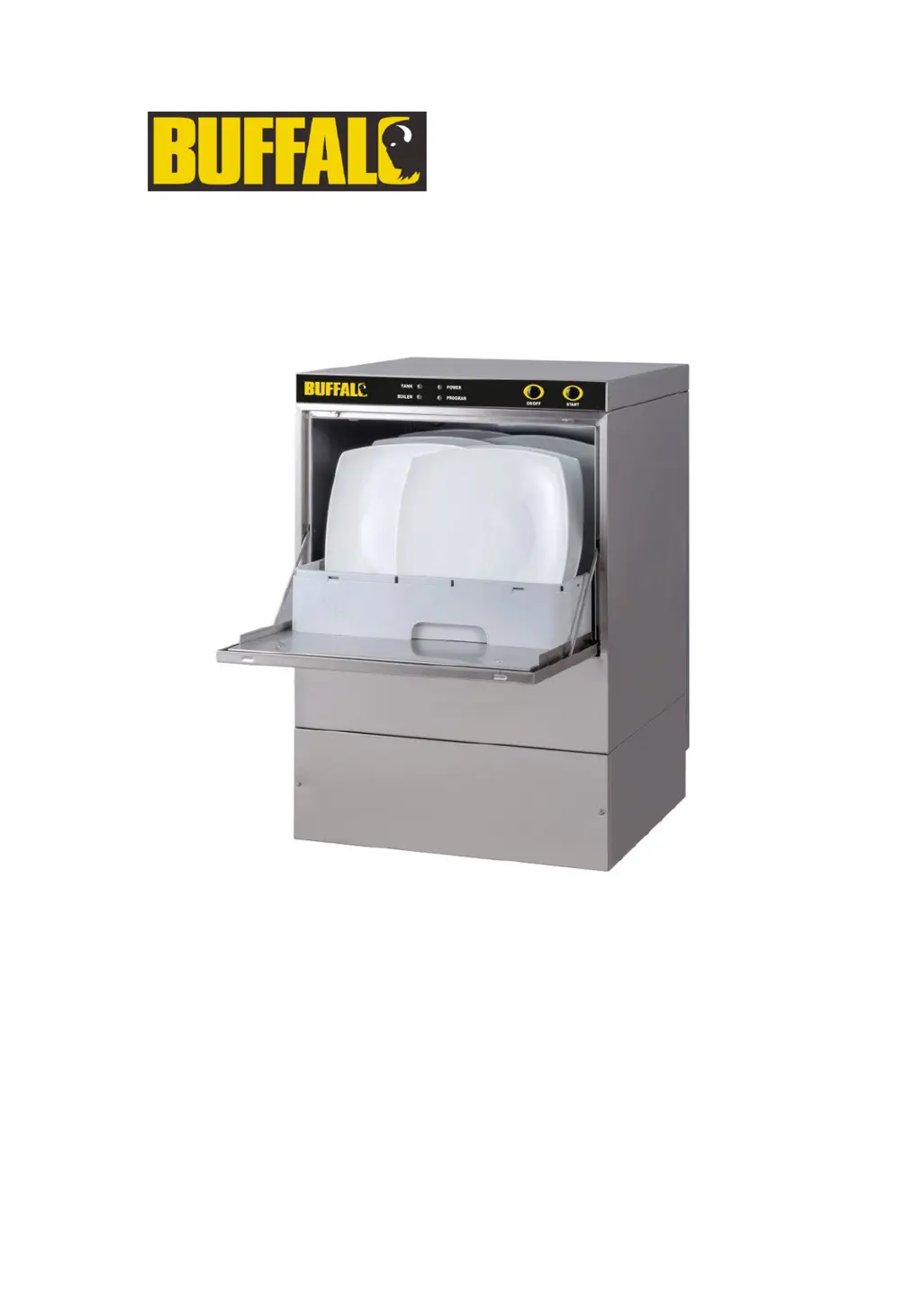 If your Buffalo Dishwasher isn't turning on, several factors could be the cause. First, check the connection and the safety fuse of the cabling. Ensure the door is fully closed to activate the door switch. Verify that there is a water supply to the water input valve and that the valve's filter isn't blocked. If the on/off switch doesn’t function or the moulded plug or the wires are damaged, contact your authorized local dealer or the manufacturer. The machine must be repaired by qualified personnel.