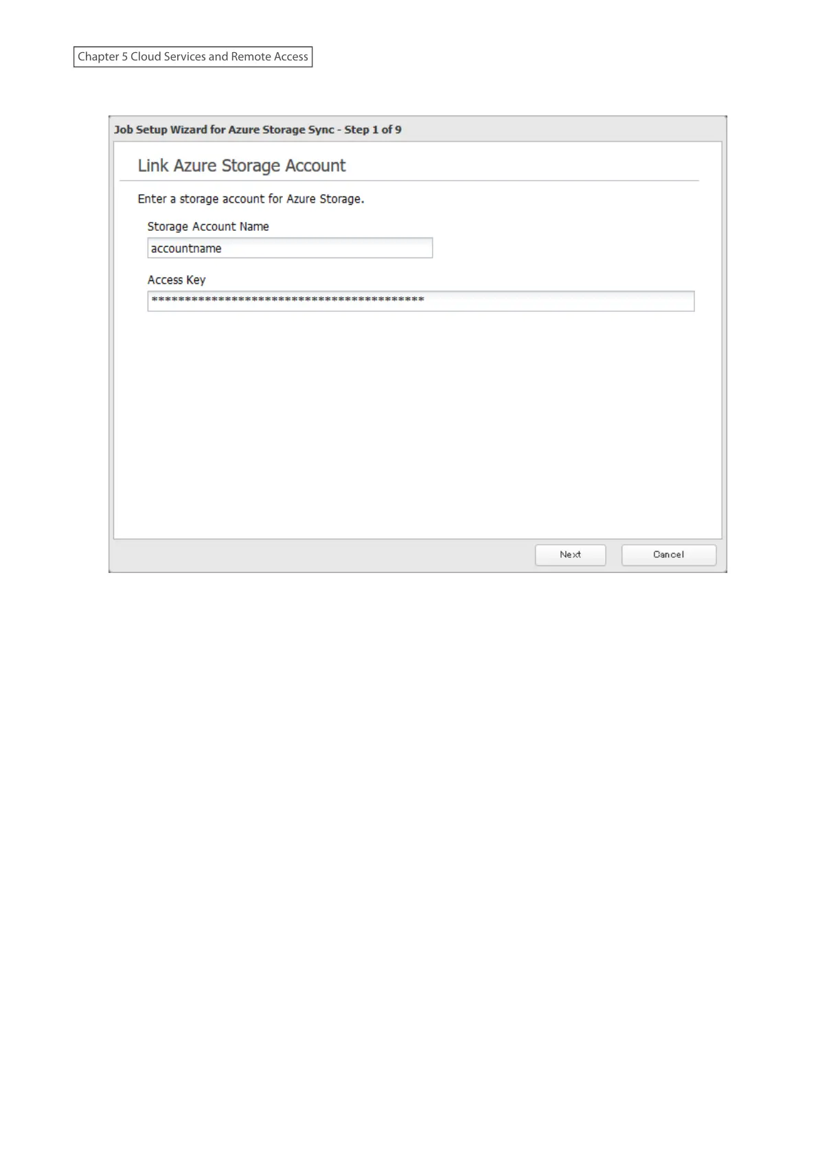 6 The job setup wizard will open. Enter your Azure Storage account name and access key, then click Next.