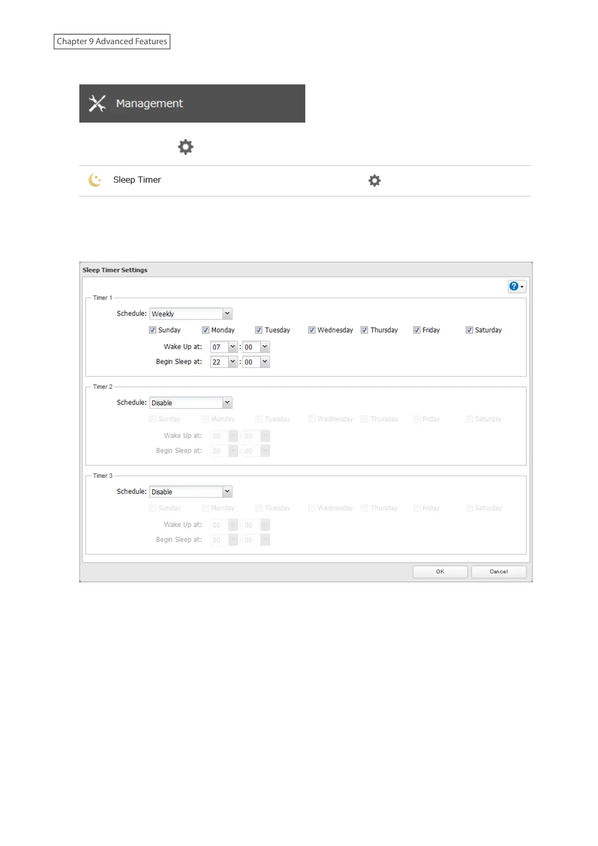 4 Specify the timer interval, wake-up time, and time to enter sleep mode, then click OK.
