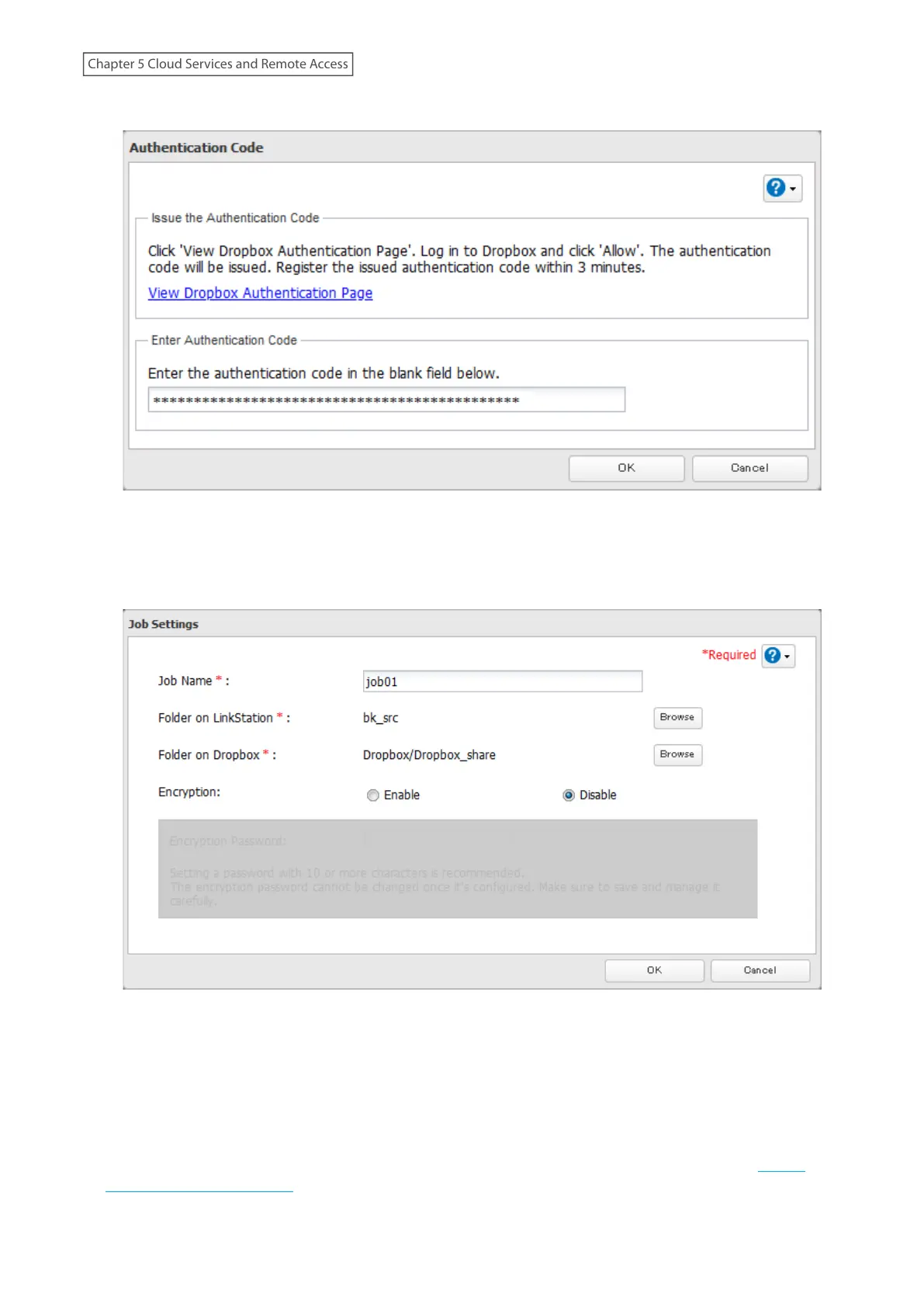 9 Enter the desired job name; select the LinkStation and Dropbox folders, and configure encryption. Click OK.
