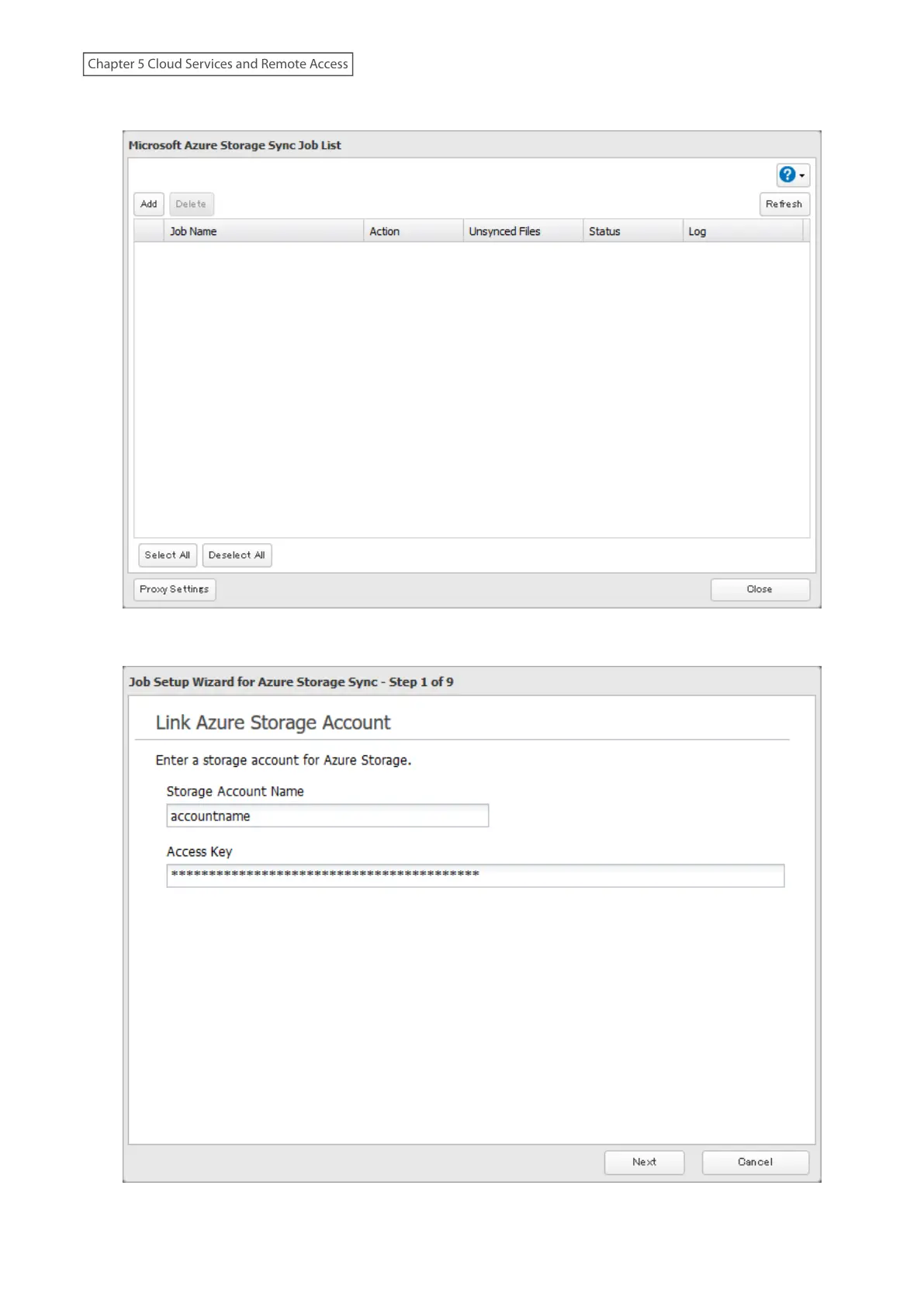 6 The job setup wizard will open. Enter your Azure Storage account name and access key, then click Next.