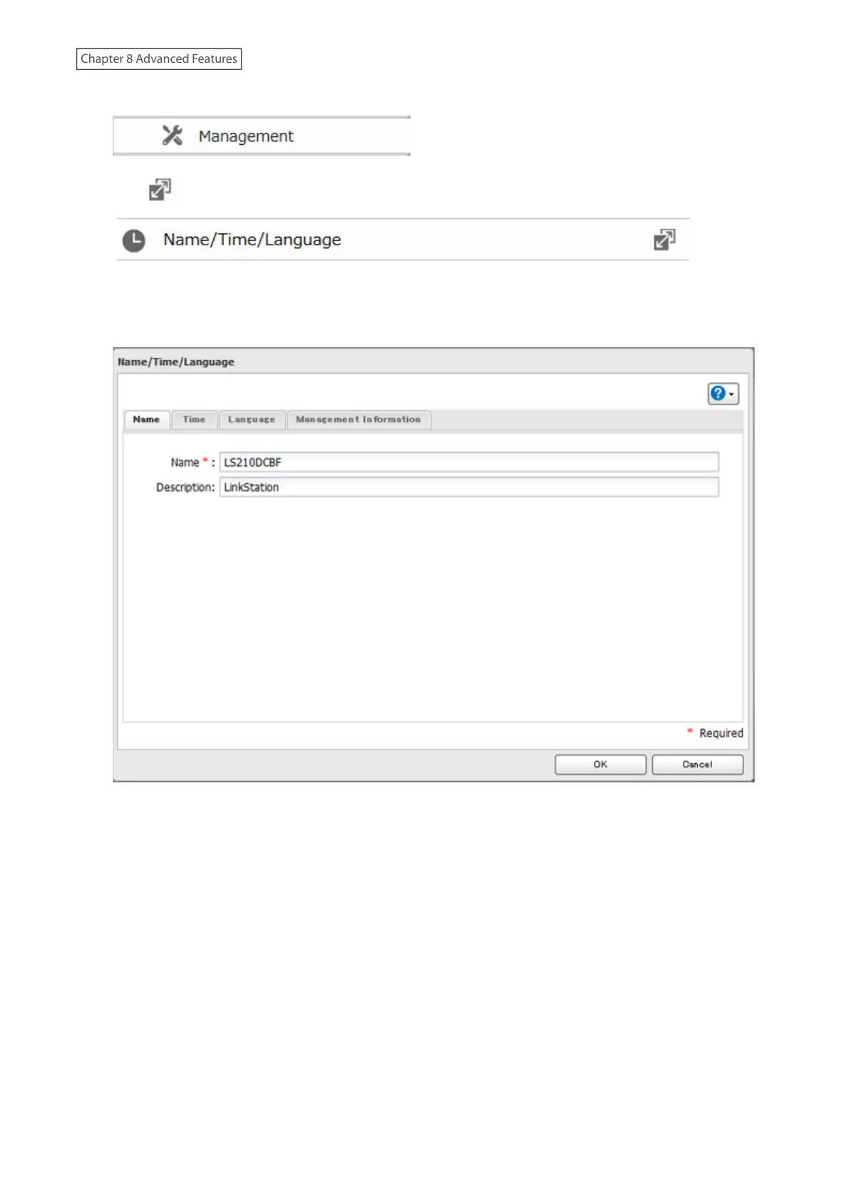 4 Click the [Name] tab, then configure the LinkStation’s name and description.