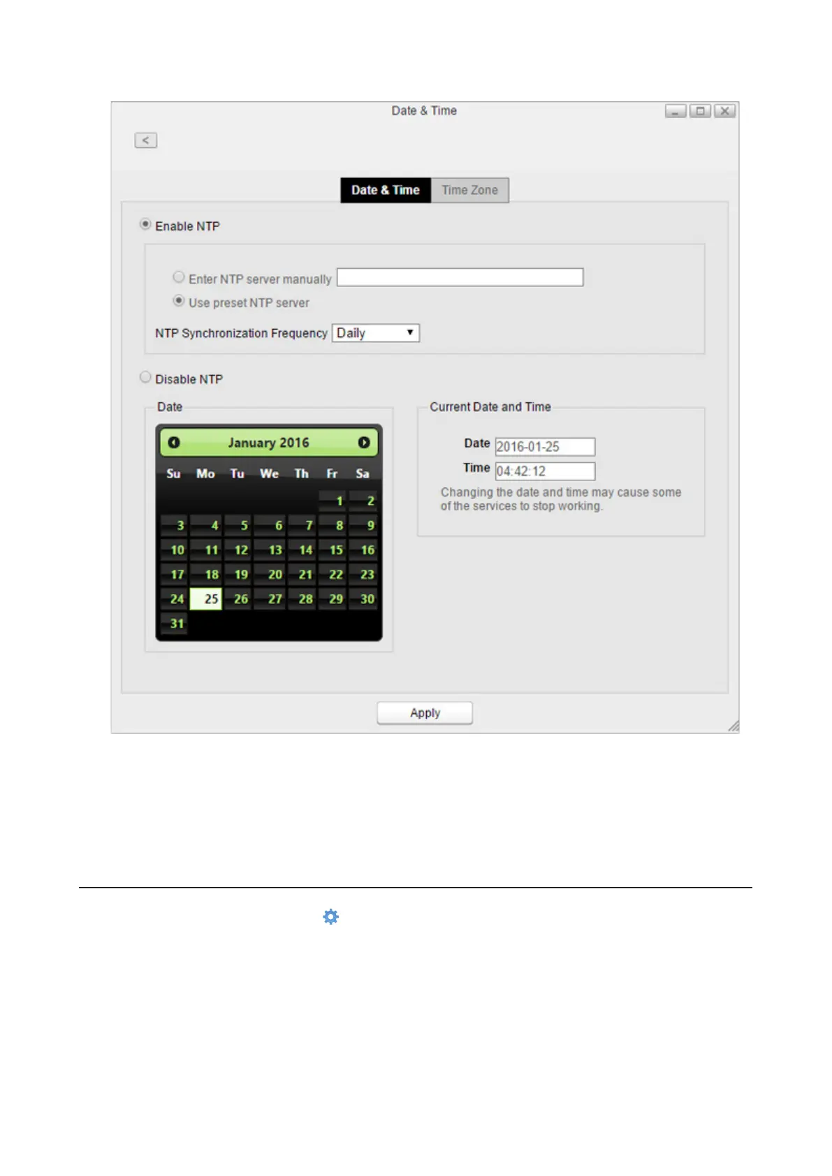 4 Select whether to enable NTP or manually set the date and time.