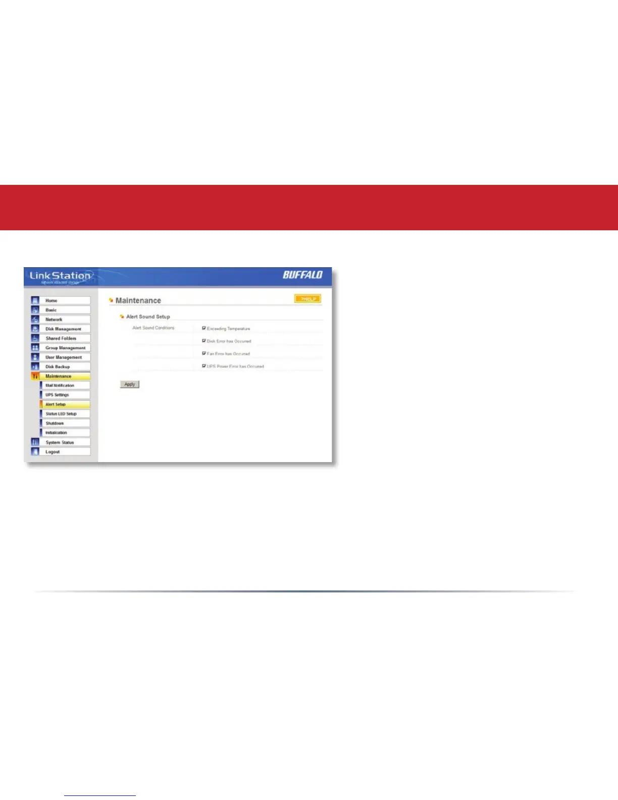 Alerts can be congured on the LinkStation to make audible noises when a problem is detected.