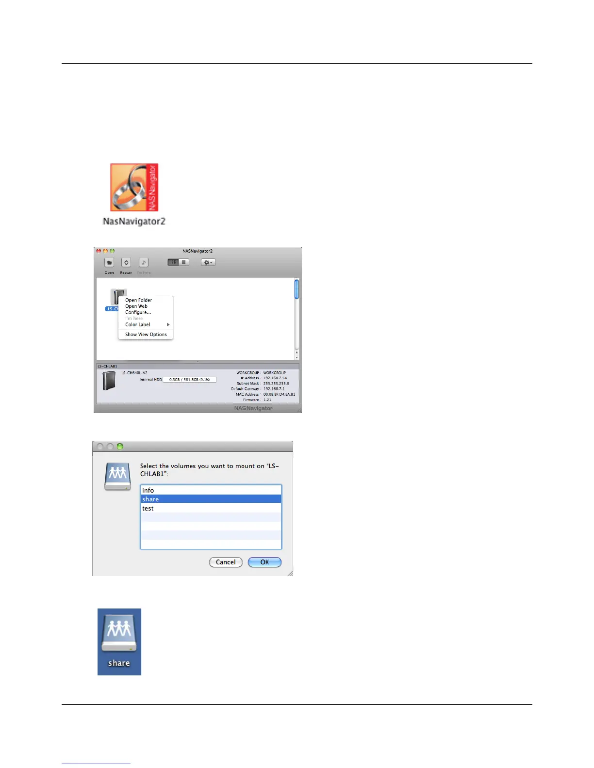 With Mac OS X 10.3 or later, use NAS Navigator2 to mount a share from the LinkStation as a drive on