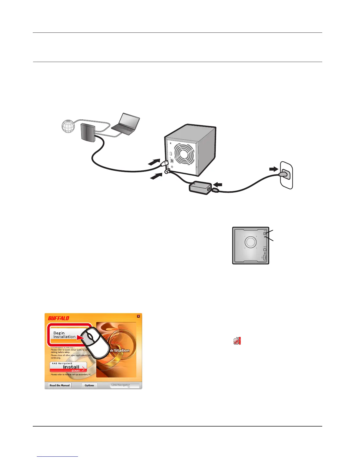 Connect the LinkStation with an Ethernet cable and the included AC adapter. Plug the power