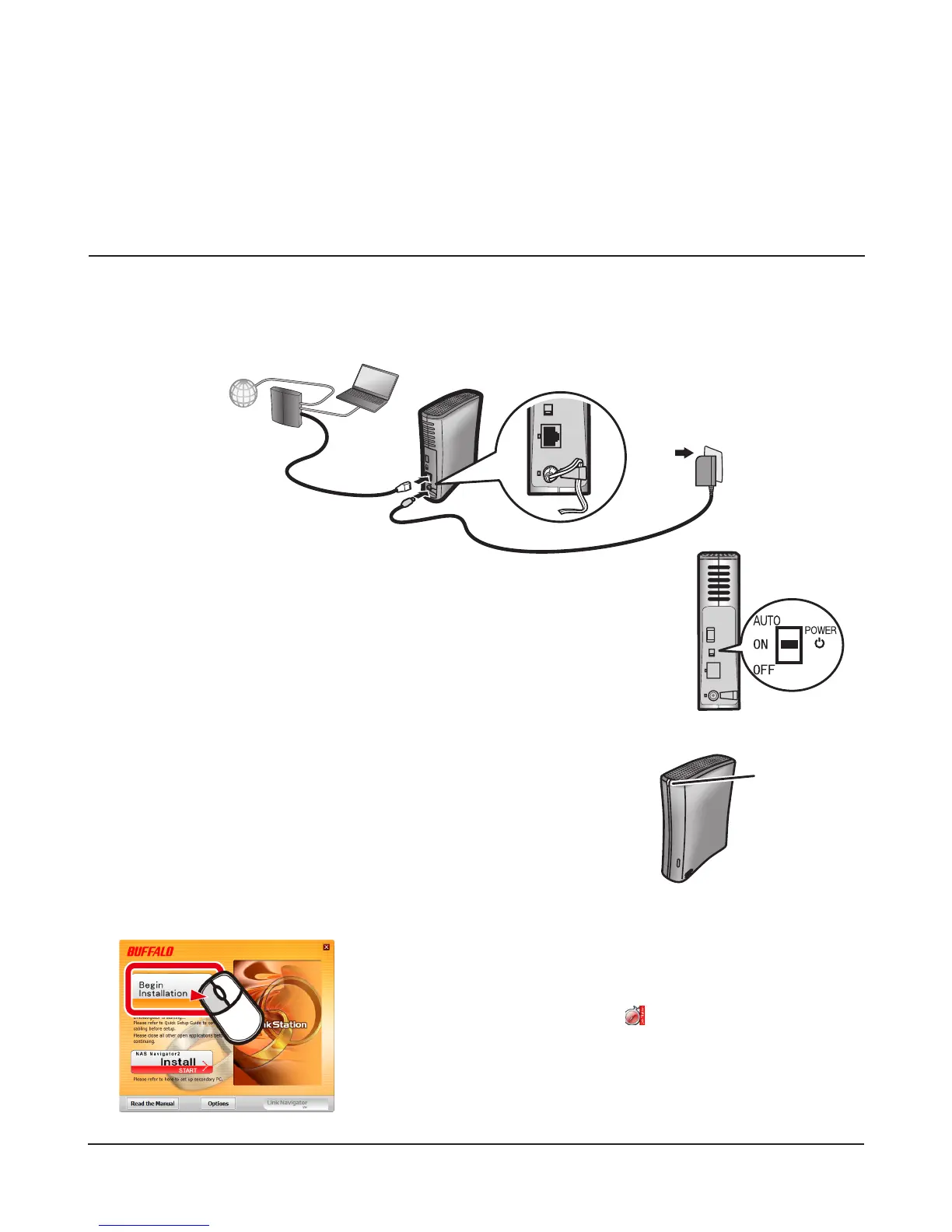 Connect the LinkStation with an Ethernet cable and the included AC adapter. Plug the power