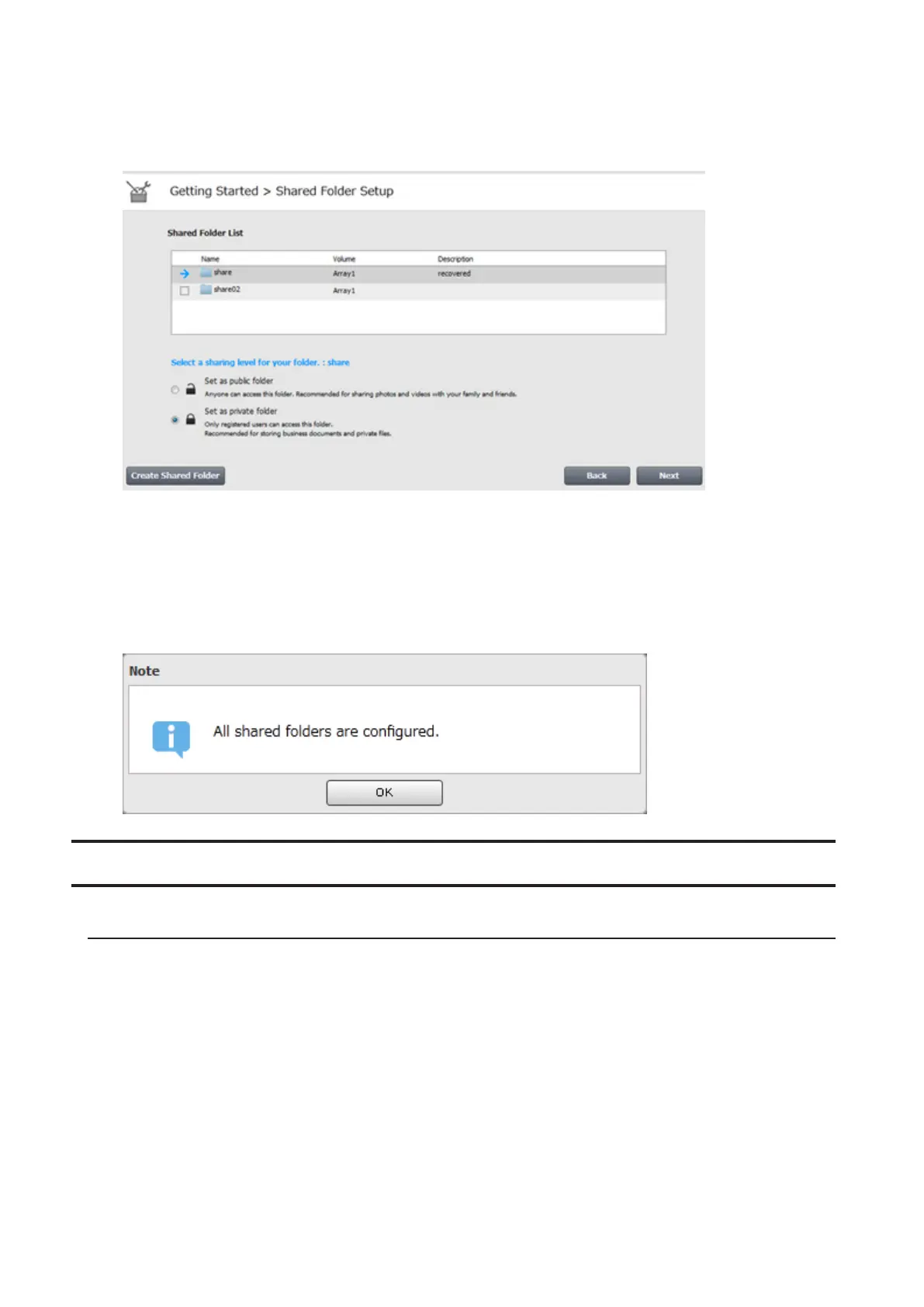 5 Configure levels of sharing for all existing shared folders (public or private) to finish the initial setup wizard.
