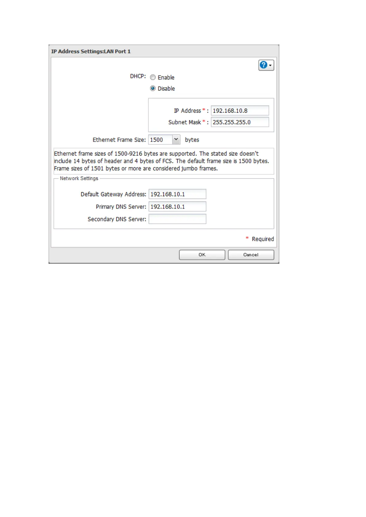 4 Disable "DHCP", enter the desired network address settings, and click OK.