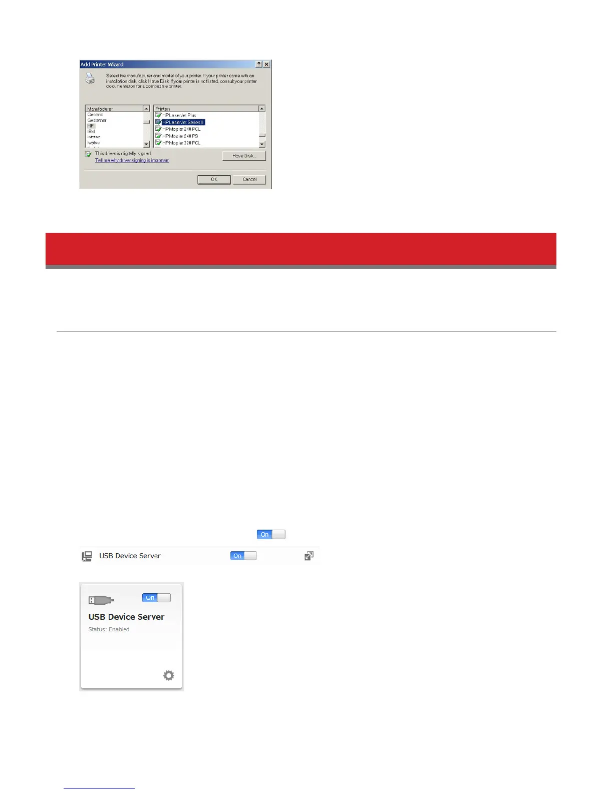 Note: USB device server and DLNA are not compatible. Disable DLNA protocol support if using USB device server.