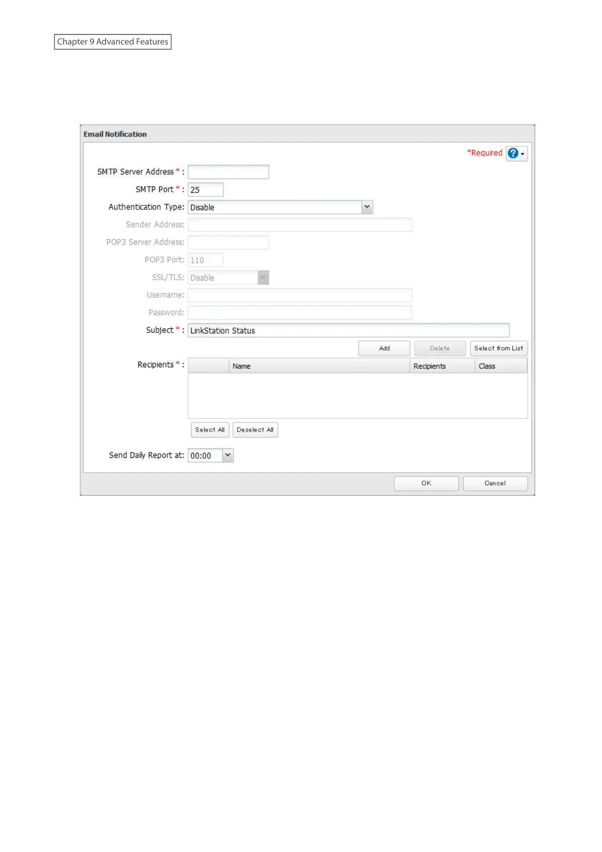 5 Enter your email server settings and the notification email’s default subject, then configure recipients and the