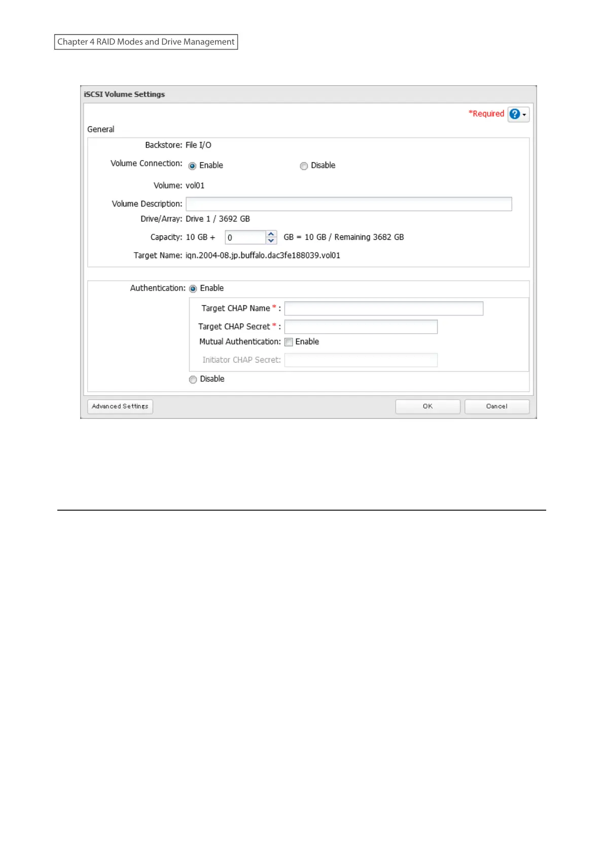4 Enable “Authentication” and enter the target CHAP name and secret, then click OK.