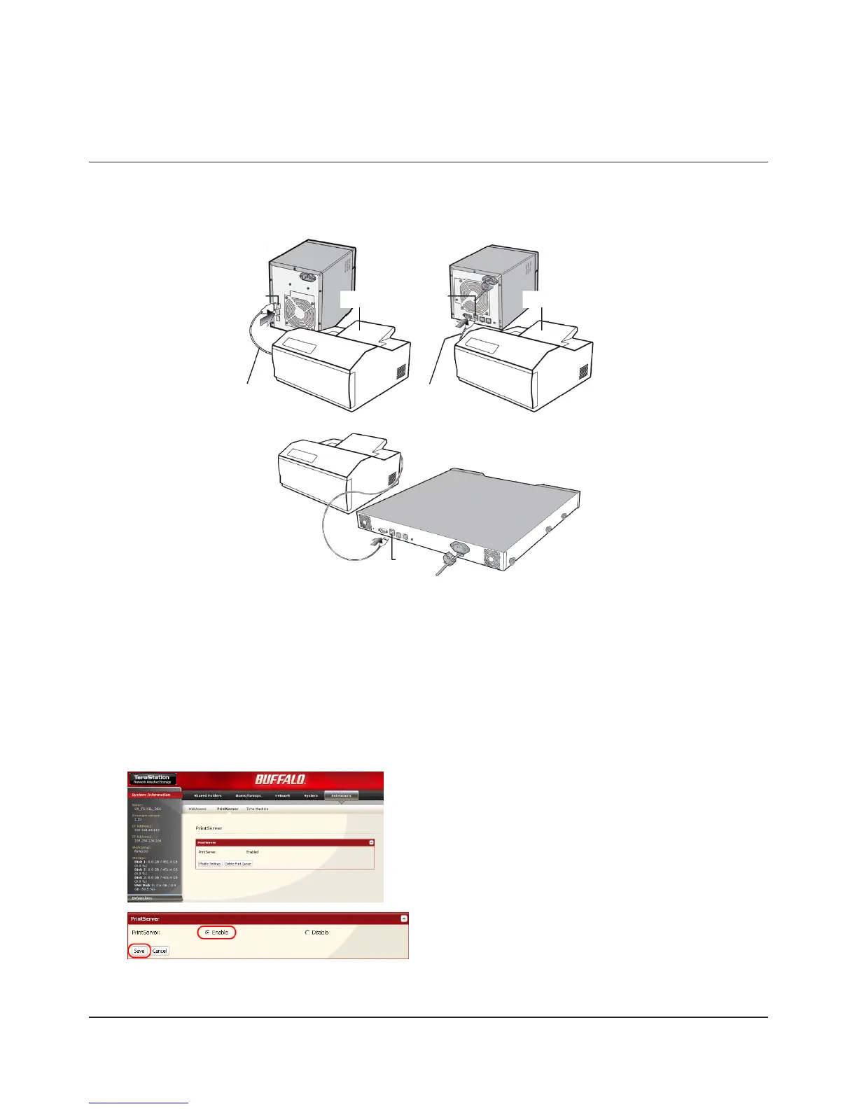 TeraStation is equipped with a USB connector on the back. You can connect a USB printer to the TeraStation as shown
