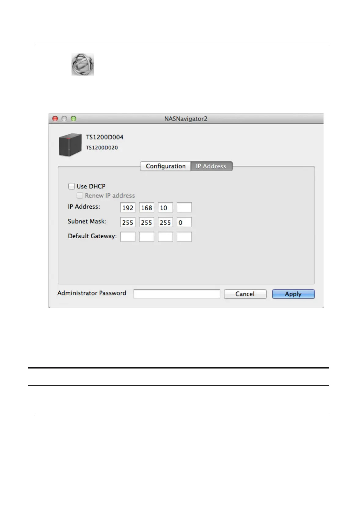 3 Uncheck "Use DHCP", enter the desired settings, and enter the administrator password, then click Apply.