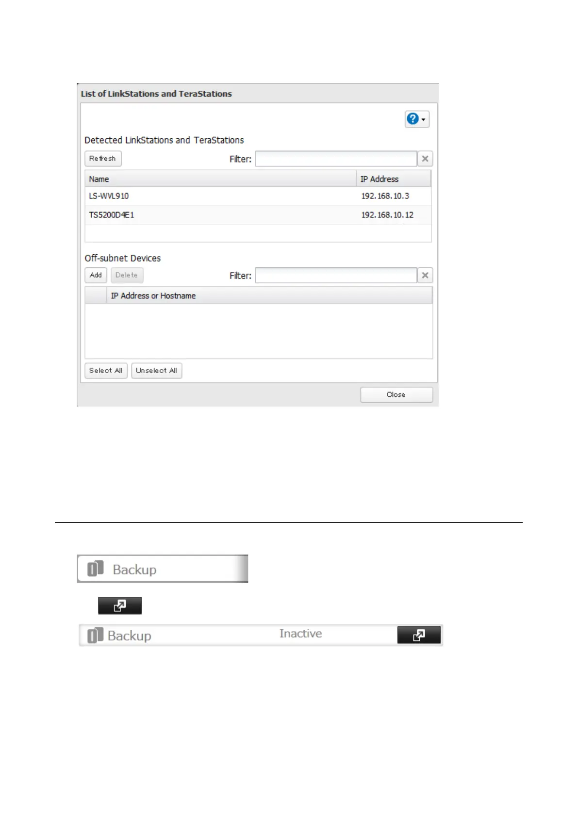 4 Click Add under "Off-subnet Devices", enter the IP address or hostname of the destination LinkStation or