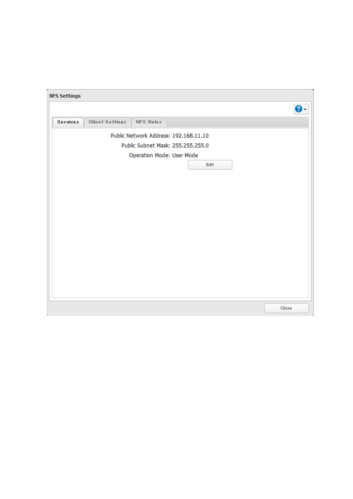 • To restrict NFS access to a specific network or client, navigate to File Sharing - NFS - Services and click Edit. Enter