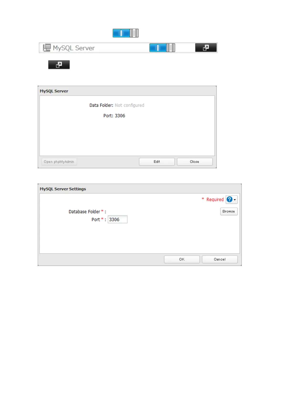 2 Move the MySQL server switch to the position to enable the MySQL server.