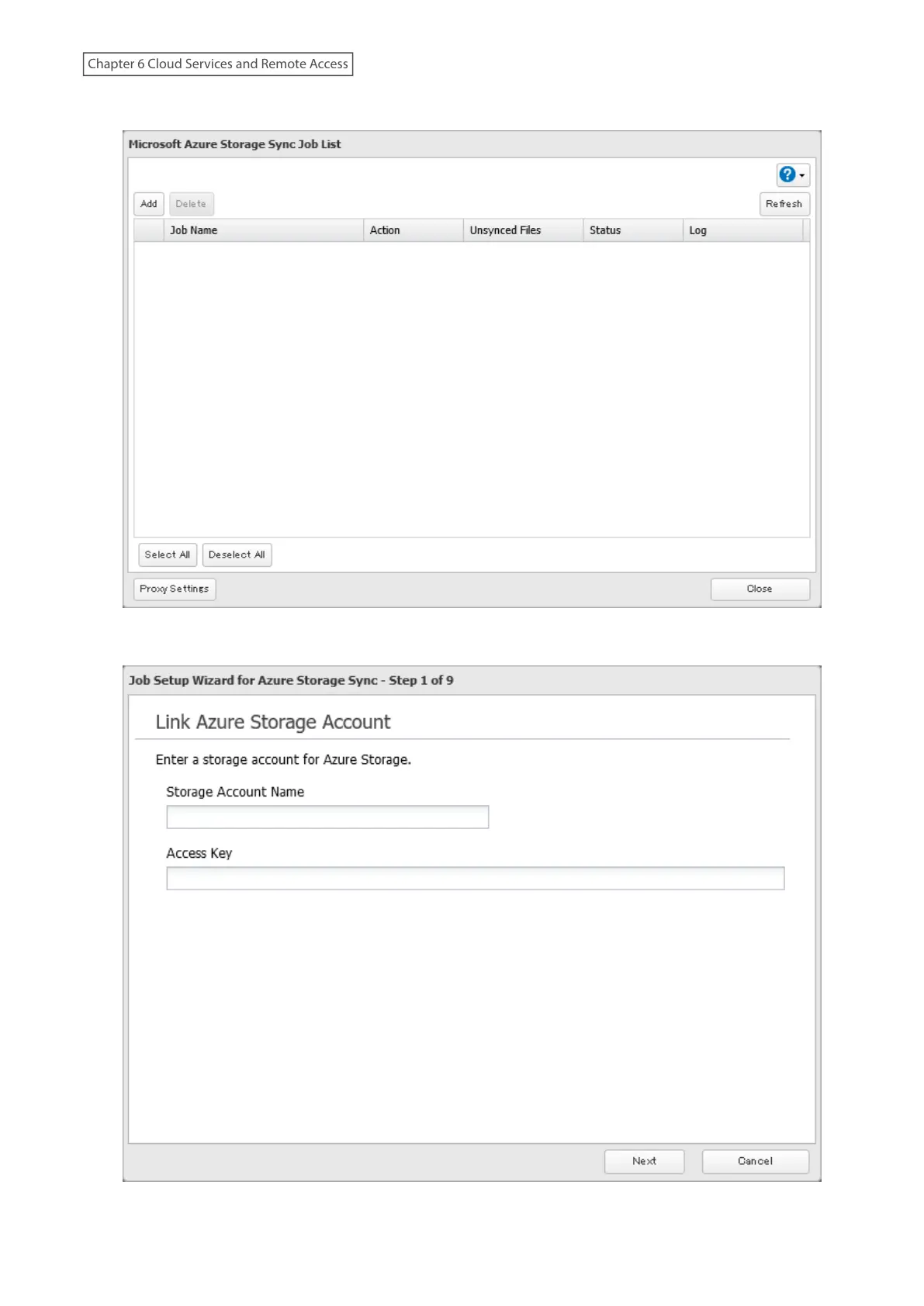 6 The job setup wizard will open. Enter your Azure Storage account name and access key, then click Next.