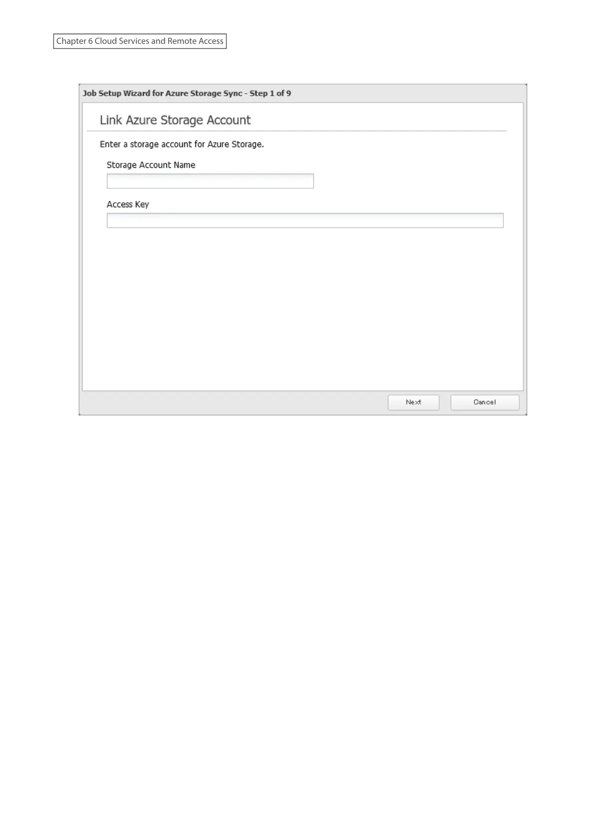 6 The job setup wizard will open. Enter your Azure Storage account name and access key, then click Next.
