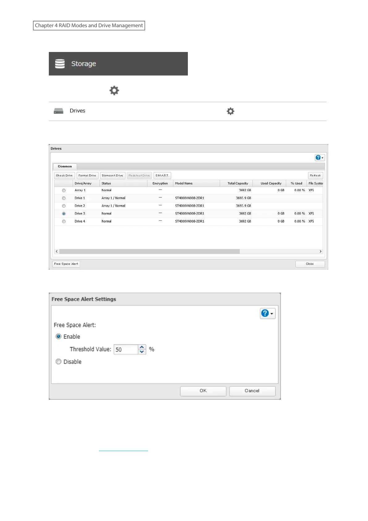 threshold percentage, a notification will appear on the Dashboard in Settings. To configure free space alert email