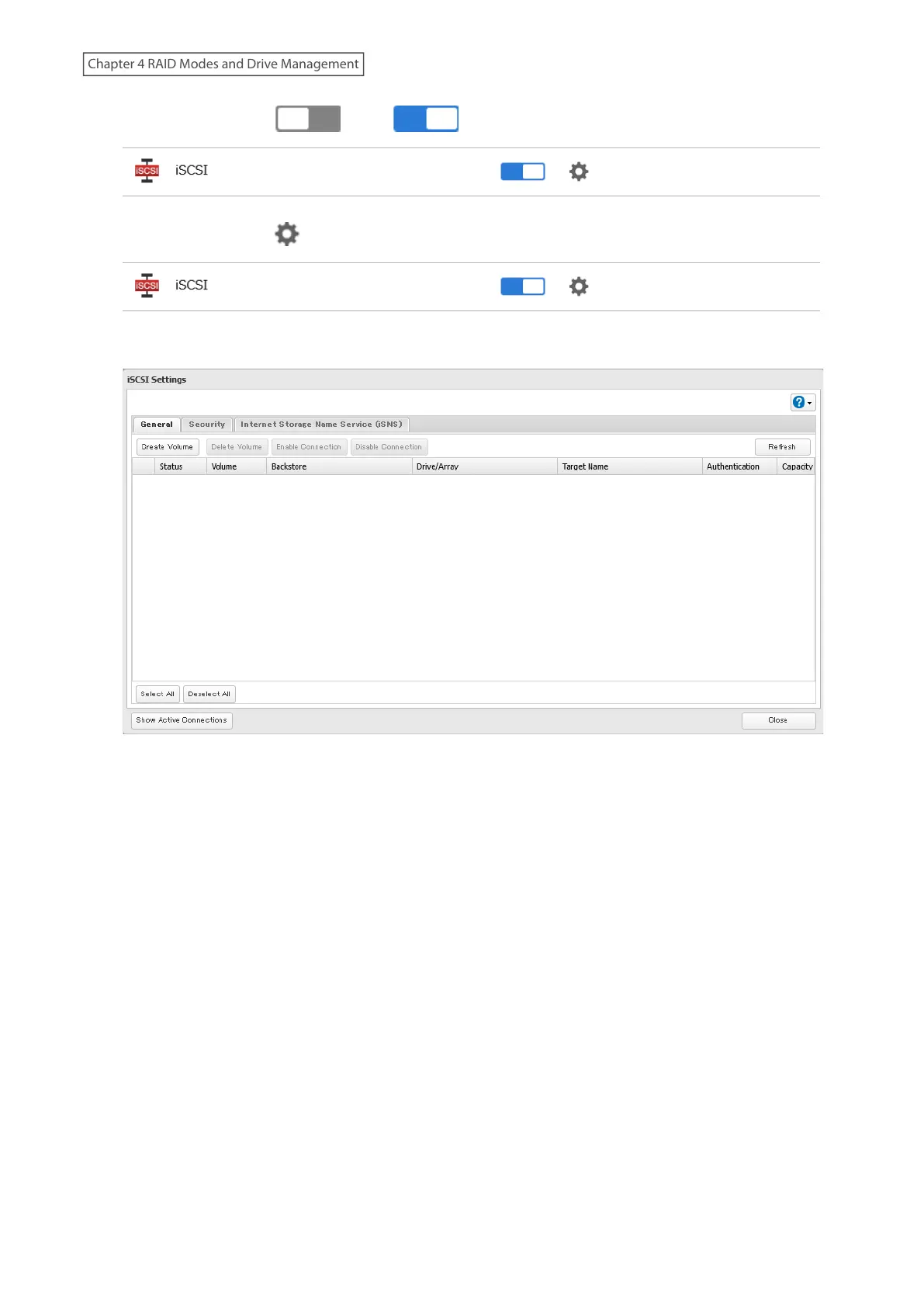 2 Move the iSCSI switch ( ) to the position to enable iSCSI.