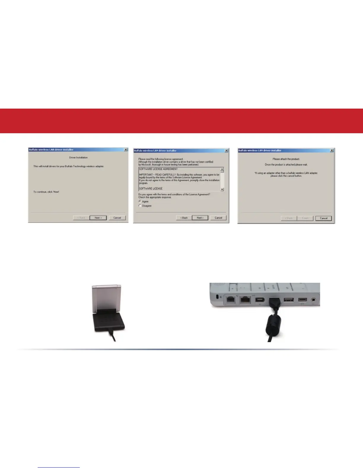 included cable into the AirStation Wireless USB Adapter and your PC’s USB port.