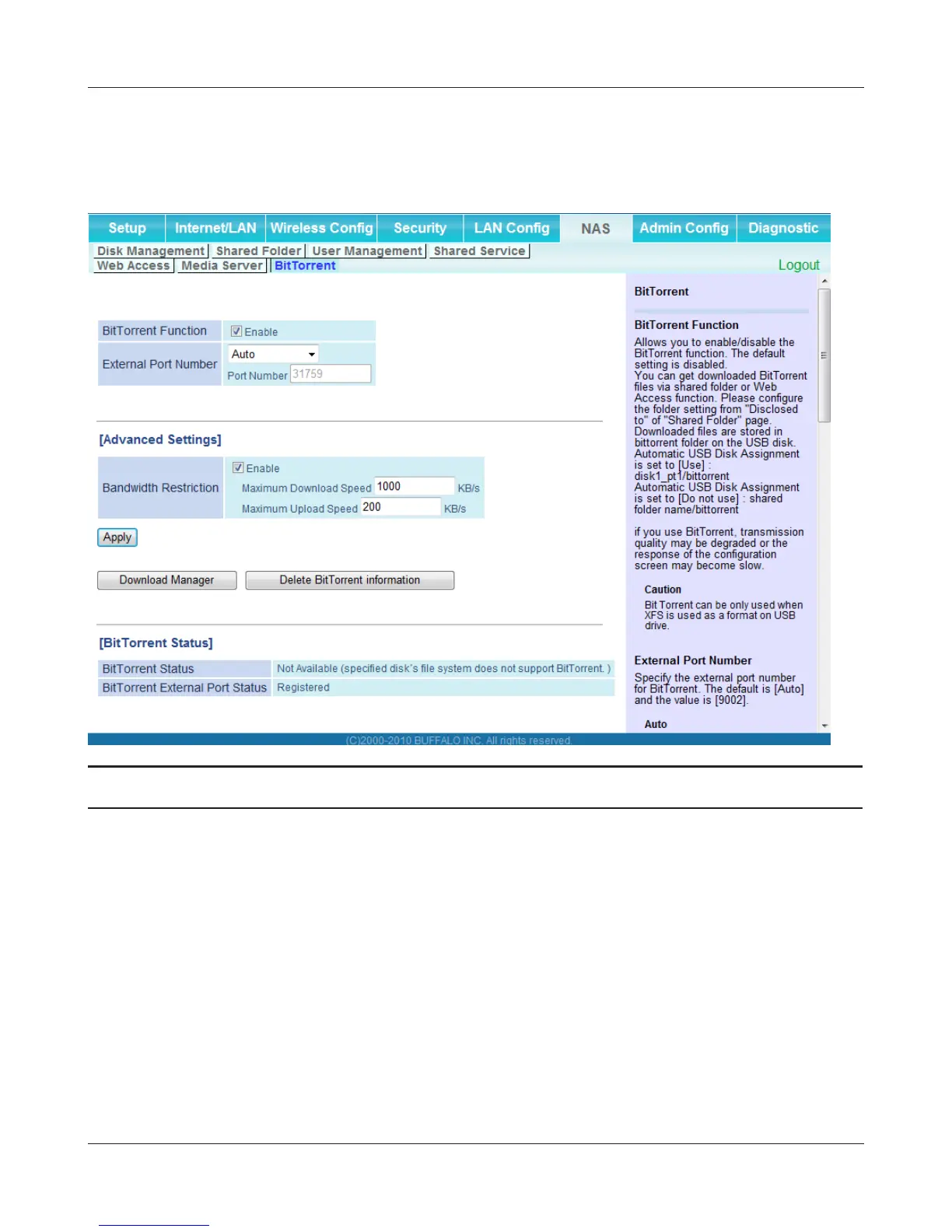 BitTorrent Function Enable to use the BitTorrent client. If the BitTorrent client is