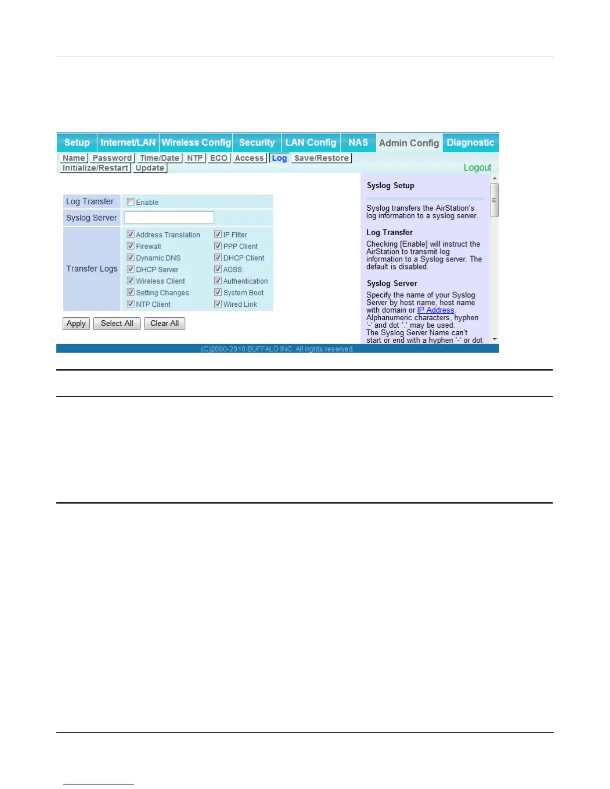 Transfer Logs Choose which logs will be transferred to the syslog server.