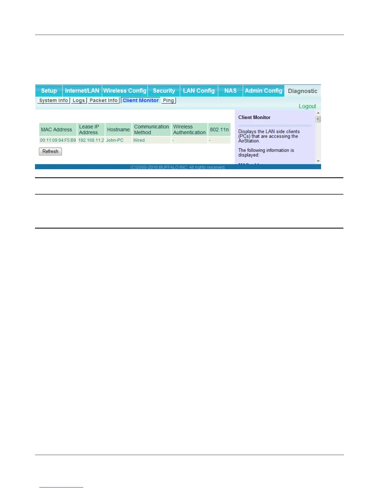 Client Monitor Displays information (MAC address, lease IP address, hostname,