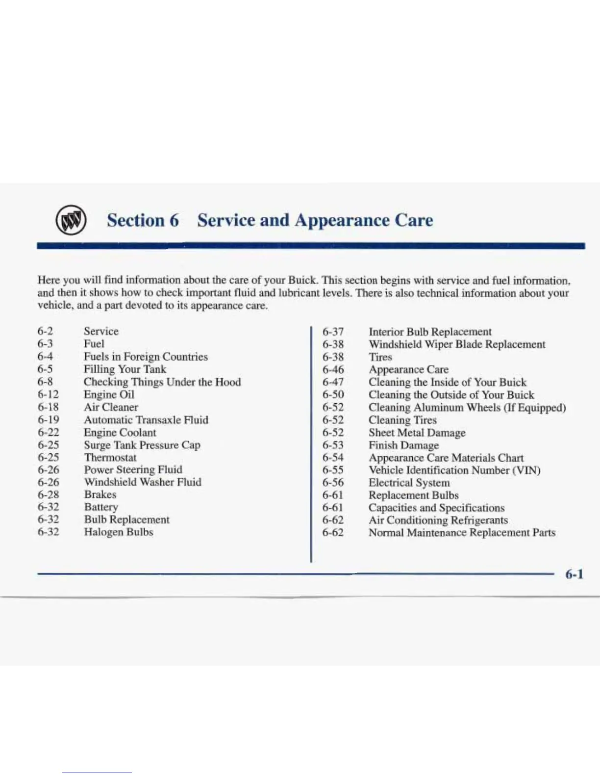 Here you will find information about the care of your Buick. This section begins with service and fuel information,