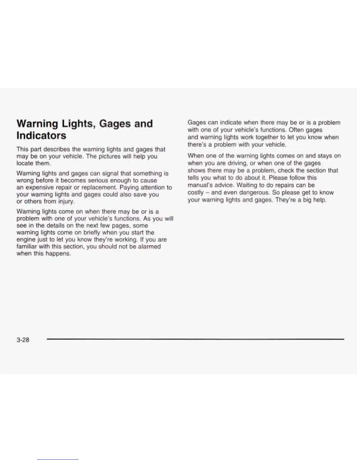 This part describes the warning lights and gages that