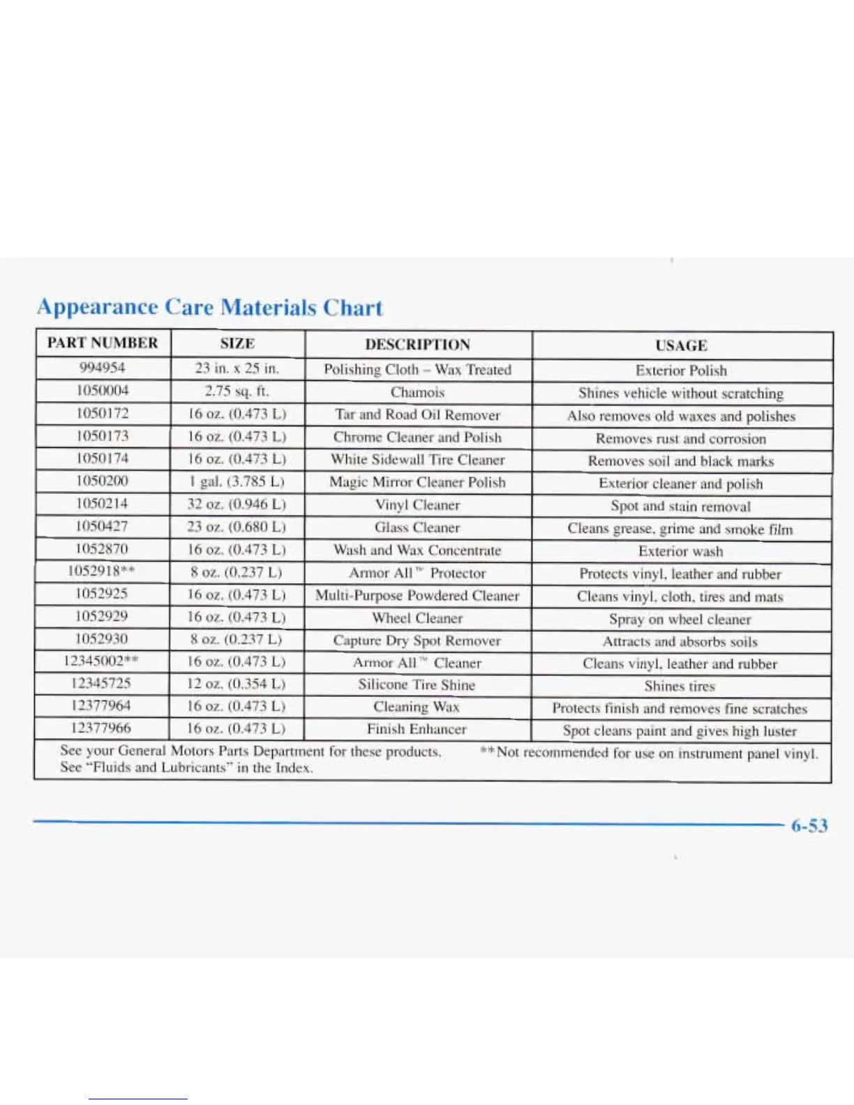 Buick LESABRE 1997 - Appearance Care Materials Chart