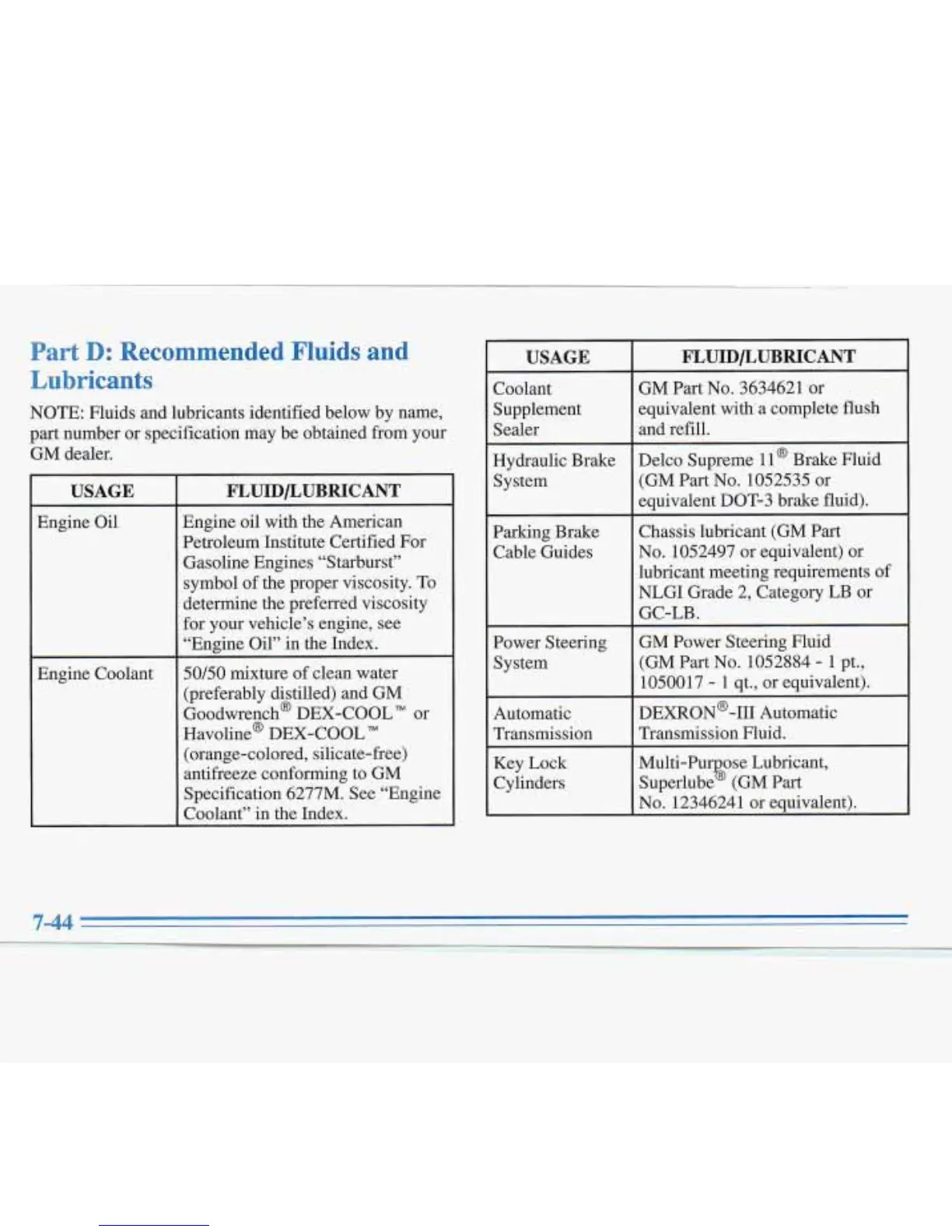 NOTE: Fluids and lubricants identified below by name,