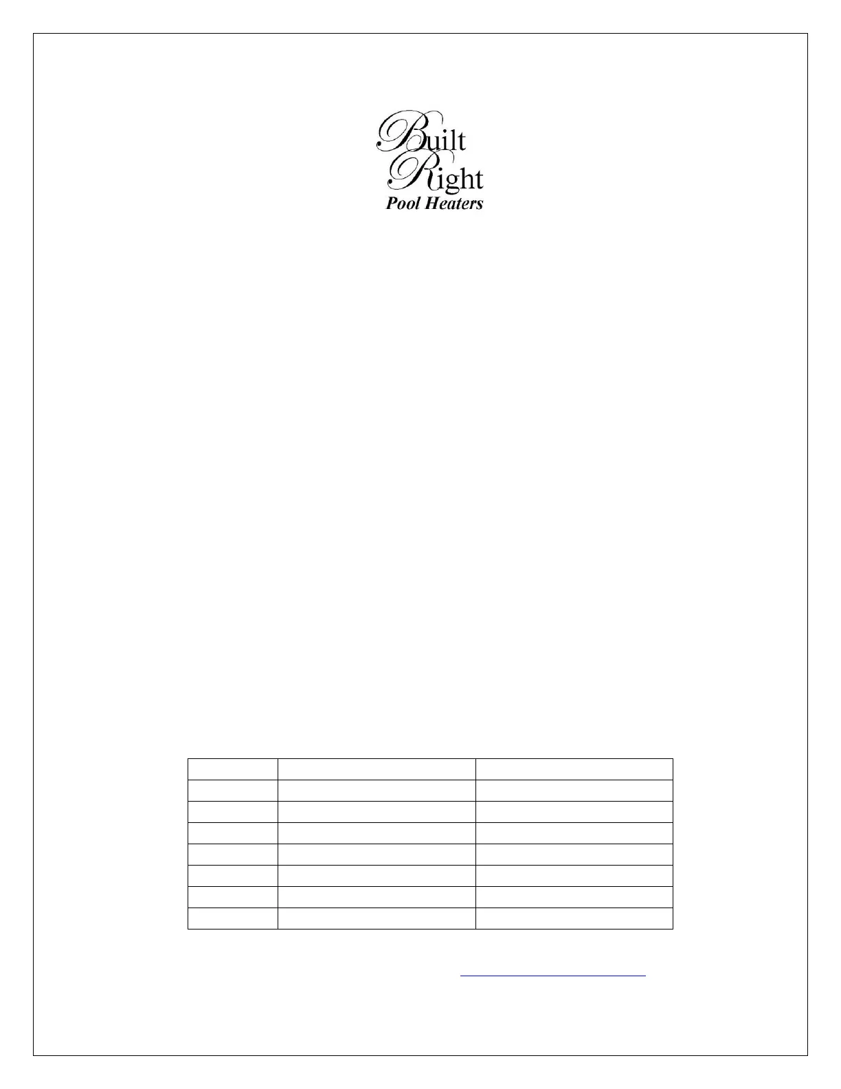 Built Right Pool Heaters, LLC warrants this Swimming Pool Heat Pump, to the original owner and installation site, to be free of
