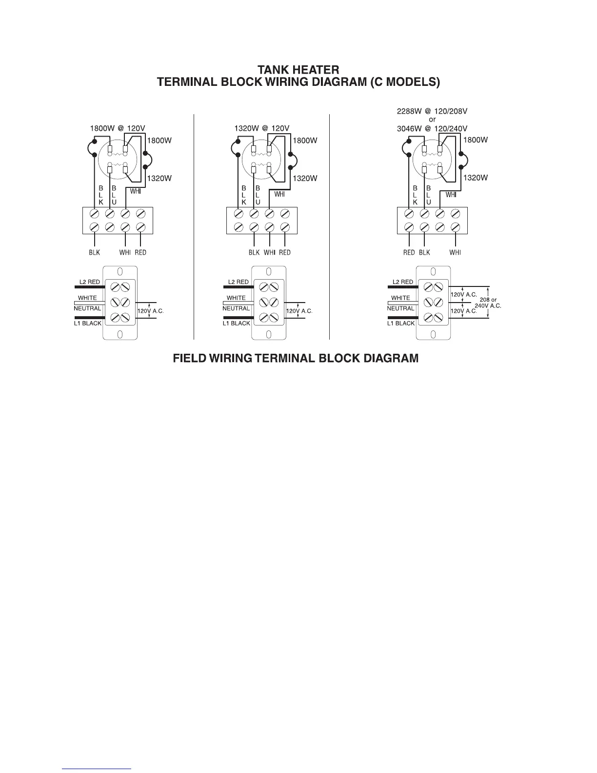9. The electrical service connections at the field wiring terminal block must agree with the tank heater terminal
