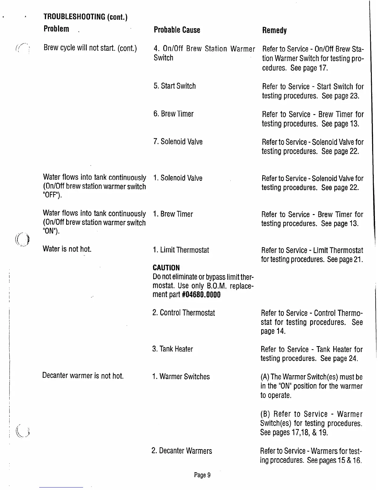 4. On/Off Brew Station Warmer Refer to Service - On/Off Brew Sta-