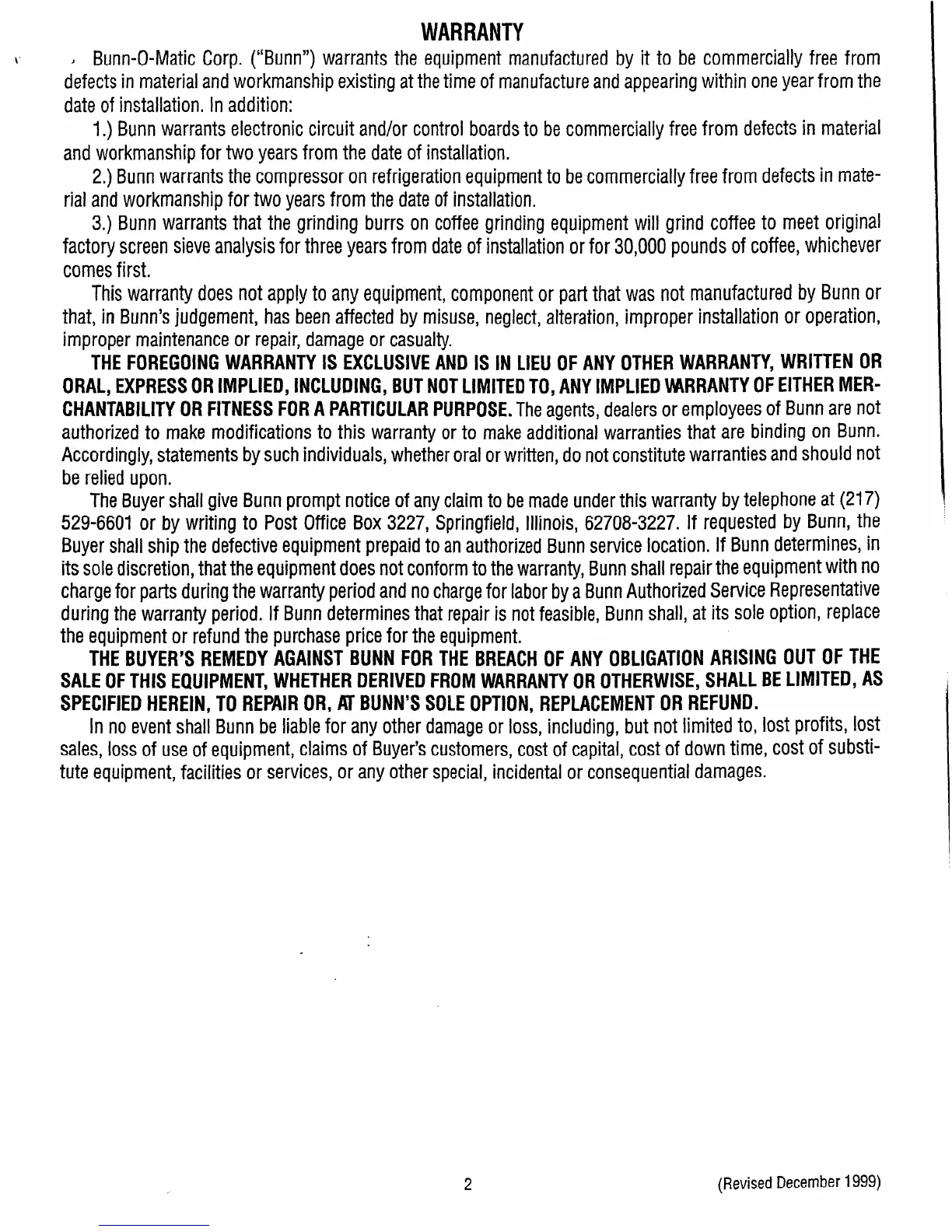 2.) Bunn warrants the compressor on refrigeration equipment to be commercially free from defects in mate-