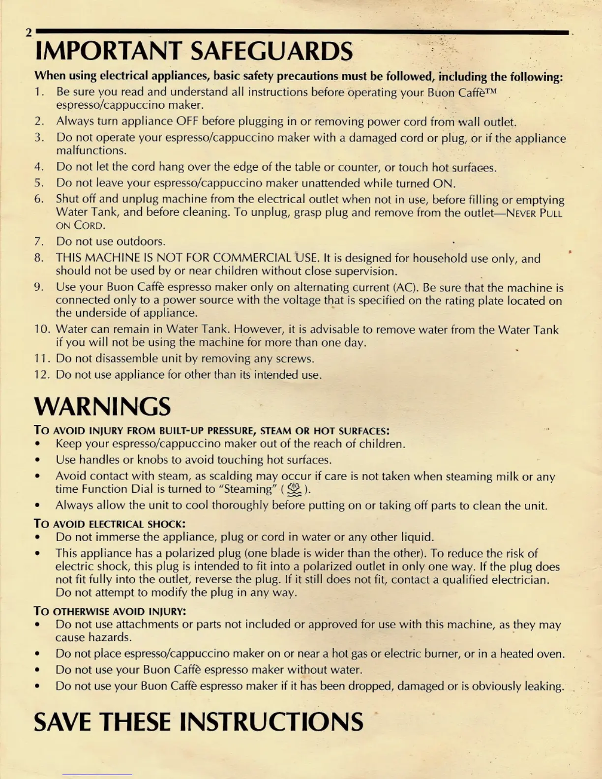 9. Use your Buon Caffe espresso maker only on alternating current (AC). Be sure that the machine is