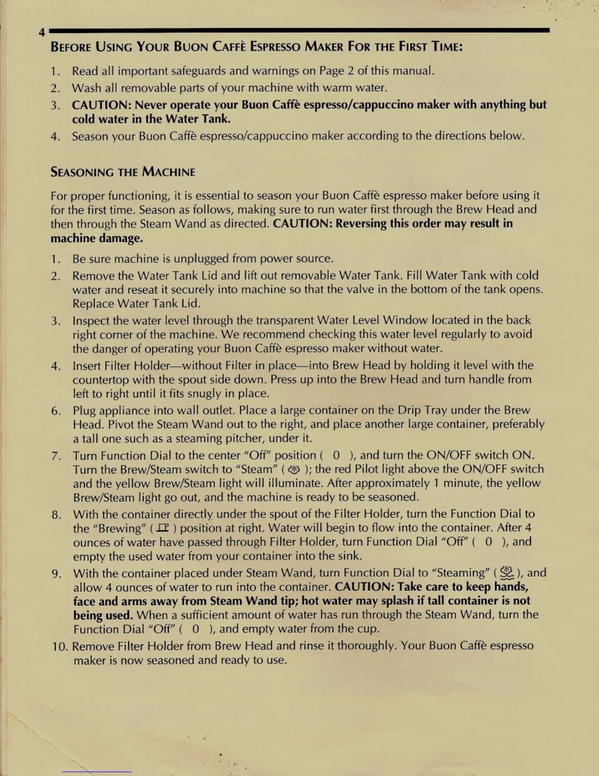 3. CAUTION: Never operate your Buon Caffe espresso/cappuccino maker with anything but