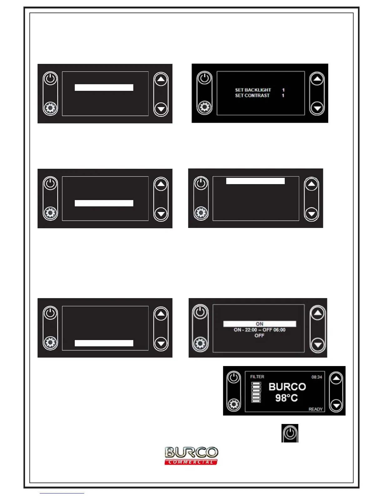 off and the only data displayed is the Burco logo along with the time and the status indicator. Water
