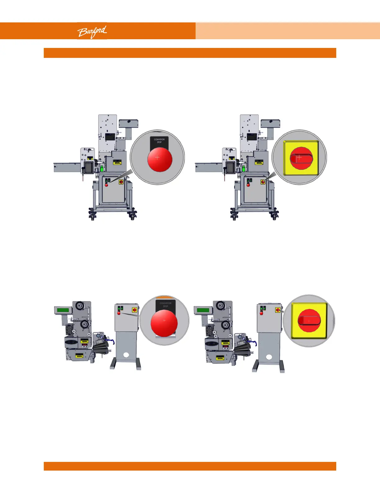 Below are the locations for the Emergency Stops (E-Stop) and the Main Disconnect on a